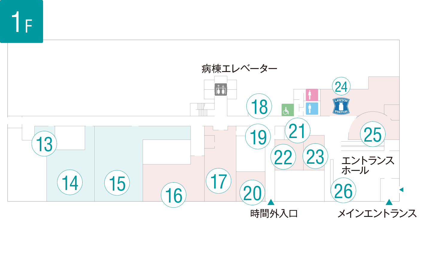 - 受付・医事科・地域医療連携室・医療福祉相談室・入退院支援センター・講堂・リハビリテーション室・RI検査室・結石破砕治療室