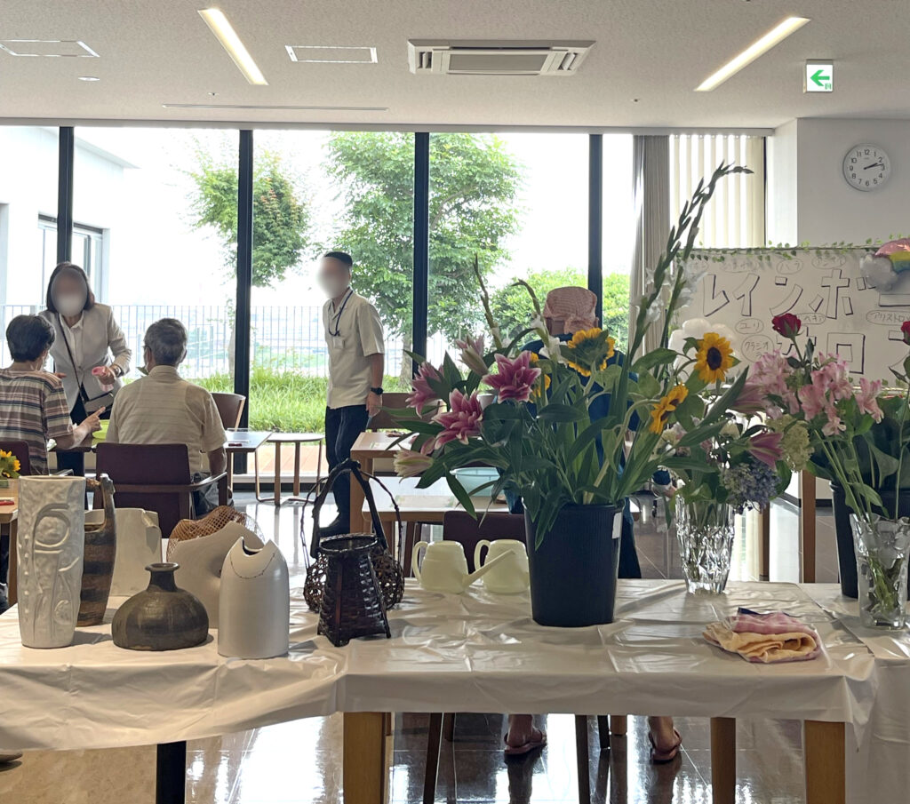 この日は、ボランティアの方々にご協力をいただき、初夏のお花で生け花をしました。ヒマワリやアジサイ、バラ などのお花もきれいで、特にユリから香るいい香りに癒されました。その後は、生けたお花を鑑賞し、きれいなお花を見ながらお茶会をしました。