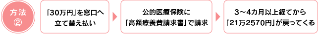 - 一旦窓口で立て替え払いをしてから、後で公的医療保険に自己負担限度額を超えた分を請求する。