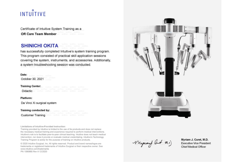 本認定は、当院婦人科で行われているロボット手術の手技や実績が高く評価されたものであり、今後もロボット手術の教育施設として全国の医師の指導・育成にあたるとともに、より多くの患者さまに安全なロボット手術を受けていただけるよう、ロボット低侵襲手術の普及に尽力して参ります。