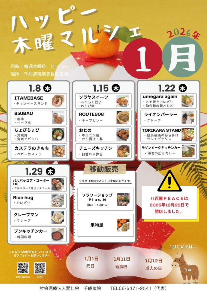 2026年1月も千船病院多目的広場(福駅前)で『ハッピー木曜マルシェ』を開催します。