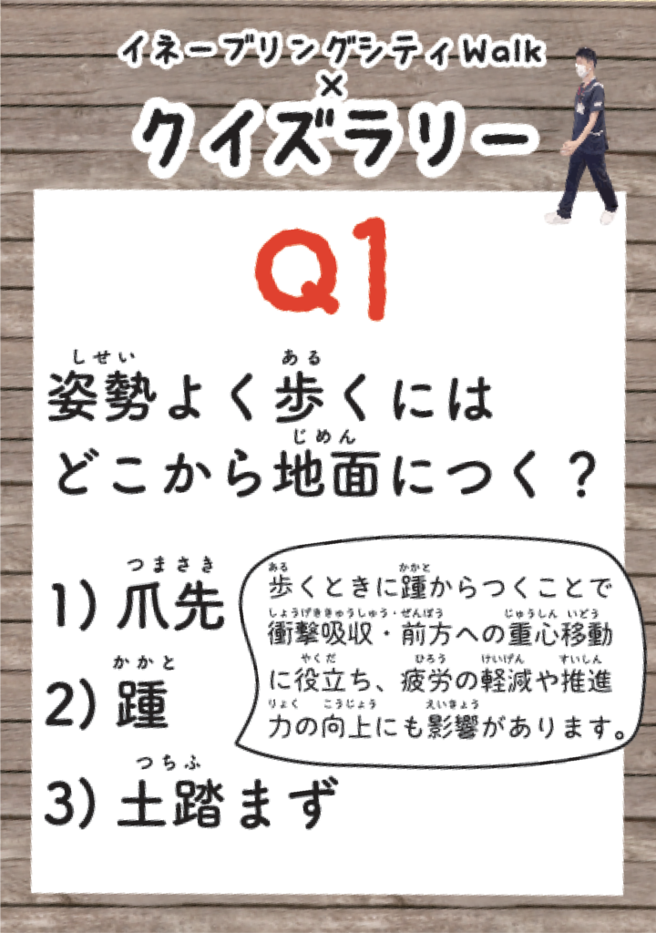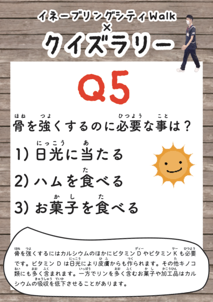健康に関する、そして新しいコミュニティスペース「憩いの空間」に関するクイズを2kmのウォーキングコース上に設置。参加者は自然と健康に関する知識を得た上で、2km歩くことになります。ちなみに「憩いの空間」は西淀川区にある修成建設専門学校の学生が作ったスペースです。全5 問のクイズに答えた参加者には阪神電車のご協力により、素敵なプレゼントがもらえます。ハッピー要素は欠かせません。