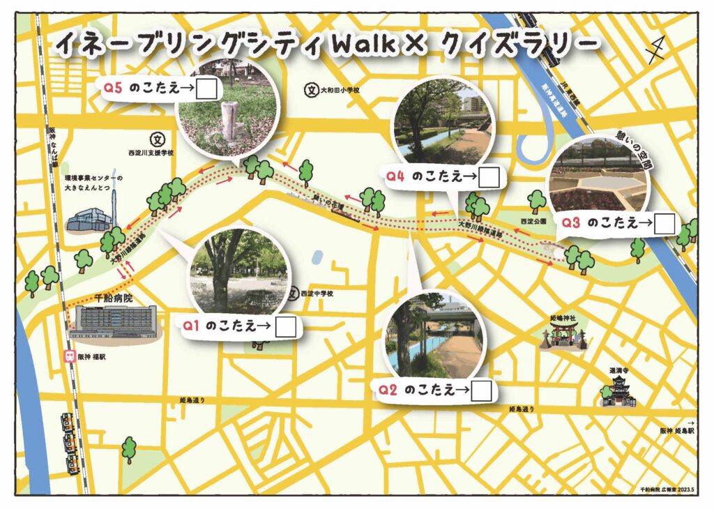 5 月14 日、千船病院では「福ハッピーフェスタ」を開催しました。「健康×まちづくり」をコンセプトとして、西淀川区を縦断する大野川緑陰道路で「イネーブリングシティウォーク」という、クイズラリーを行いました。イネーブリングシティとは「健康と幸福」が両立する街を意味します。
