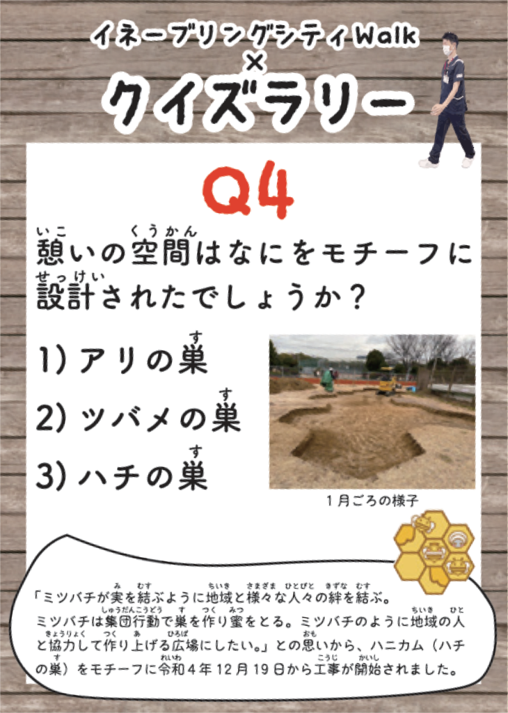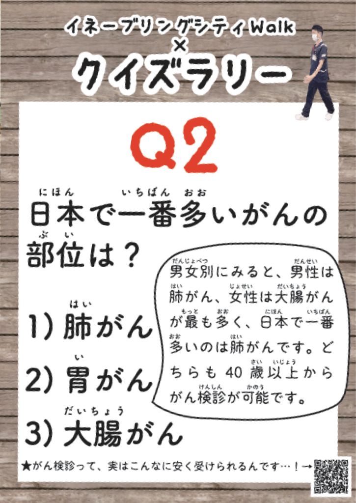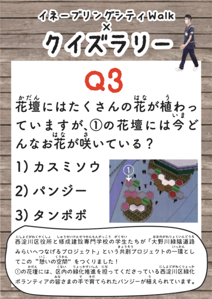 健康に関する、そして新しいコミュニティスペース「憩いの空間」に関するクイズを2kmのウォーキングコース上に設置。参加者は自然と健康に関する知識を得た上で、2km歩くことになります。ちなみに「憩いの空間」は西淀川区にある修成建設専門学校の学生が作ったスペースです。全5 問のクイズに答えた参加者には阪神電車のご協力により、素敵なプレゼントがもらえます。ハッピー要素は欠かせません。